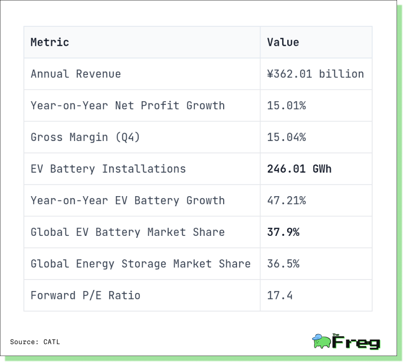 This table summarizes CATL's key financial and operational metrics for 2024. Despite a revenue decline due to lower lithium prices, CATL maintained strong profitability and market leadership.