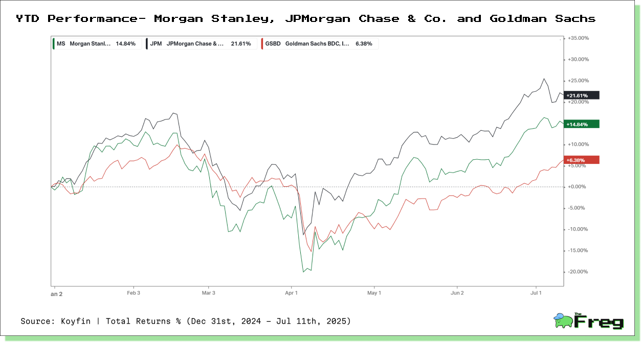 - JPMorgan Chase leads with a 21.61% gain, widely outperforming both Morgan Stanley and Goldman Sachs. This reflects robust earnings momentum and a strong balance across retail, investment banking, and wealth businesses.