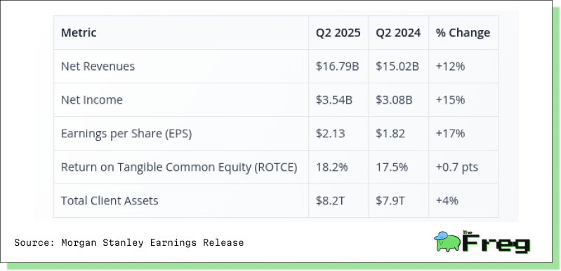 Beneath the strong headline numbers, the business mix is clearly evolving. Softer investment banking results are being offset by robust trading and fee-based flows. With improved ROTCE and steady asset growth, Morgan Stanley is increasingly positioned for resilience—less reliant on Wall Street cycles, and more anchored in Main Street stability.