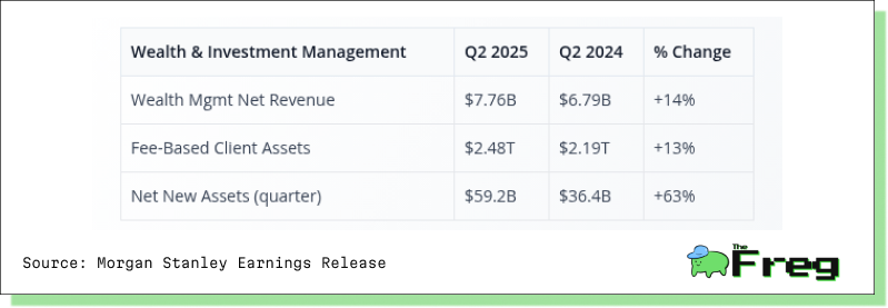 Morgan Stanley’s wealth management and investment management divisions now command $8.2 trillion in client assets, continuing a trajectory of robust asset growth, inflows, and resilience. Wealth management generated $7.8 billion in quarterly revenue (up 14%) with growing net new assets ($59 billion in Q2) and record fee-based flows ($43 billion). Fee-based assets represent the bulwark against volatile trading or deal flow, giving the firm a more stable earnings engine.