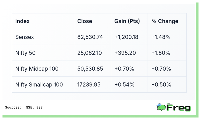 The Sensex vaulted 1,200 points to close at 82,530.74, while the Nifty 50 jumped 395.20 points (1.6%) to end at 25,062.10. Market capitalization across BSE-listed firms expanded by ₹5.05 lakh crore, pushing total m-cap to ₹439.94 lakh crore. Importantly, 49 of the 50 Nifty components ended in the green—an emphatic signal of broad-based optimism.