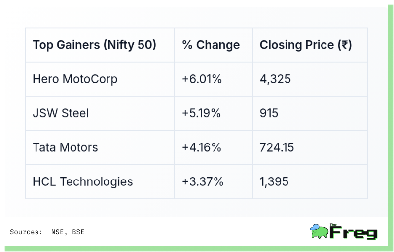 All major sectoral indices closed in the green. Nifty Auto and Realty were the top performers, while Financials and IT also saw meaningful gains.