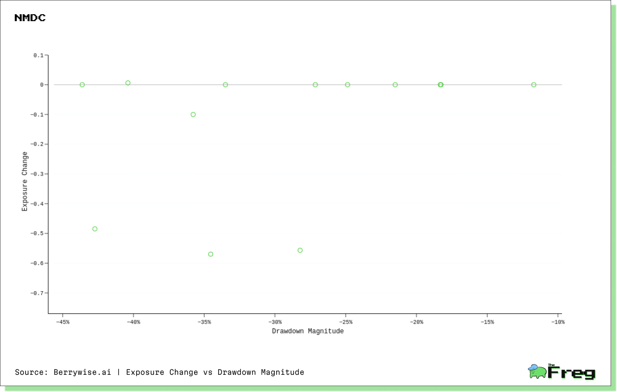 NMDC typically experiences a decrease in its Value factor exposure during drawdowns, with only 7.7% of drawdown periods showing increased value characteristics. This suggests that during market stress, NMDC temporarily loses some of its value identity, potentially behaving more like a growth or momentum stock. The average Beta change during drawdowns is relatively small at -0.1311, confirming this shift away from value characteristics under pressure.