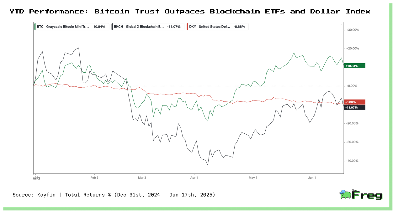 A comparison between Grayscale Bitcoin Mini Trust, Global X Blockchain ETF and the U.S. Dollar Index underscores the shifting dynamics in global asset performance in the wake of growing regulatory clarity around U.S. dollar–backed stablecoins. Grayscale Bitcoin Mini Trust (BTC) has outperformed traditional macro indicators, rising +15.05% since early 2025—a move that coincides with legislative momentum behind the GENIUS Act. This surge suggests markets are increasingly pricing in a legitimized future for digital assets underpinned by U.S. policy support. Meanwhile, Global X Blockchain ETF (BKCH) has fallen -6.40%, indicating investor scepticism around blockchain equity plays that lack direct exposure to regulated, reserve-backed tokens.