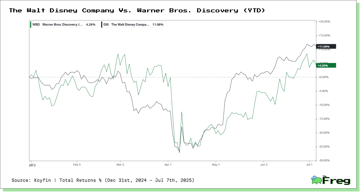 The chart above presents the YTD total return performance for Warner Bros. Discovery (WBD) and The Walt Disney Company (DIS) through early July 2025.