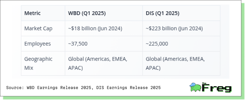 Disney’s market capitalization dwarfs that of WBD, reflecting its superior scale, profitability, and investor confidence. Disney’s workforce is also significantly larger, supporting its vast global operations and physical assets. Both companies have a global footprint, but Disney’s brand equity and international reach are unmatched in the sector. WBD’s lower valuation reflects investor caution around its leverage, integration challenges, and the durability of its traditional TV business, while Disney’s strong balance sheet and diversified operations underpin its sector leadership.