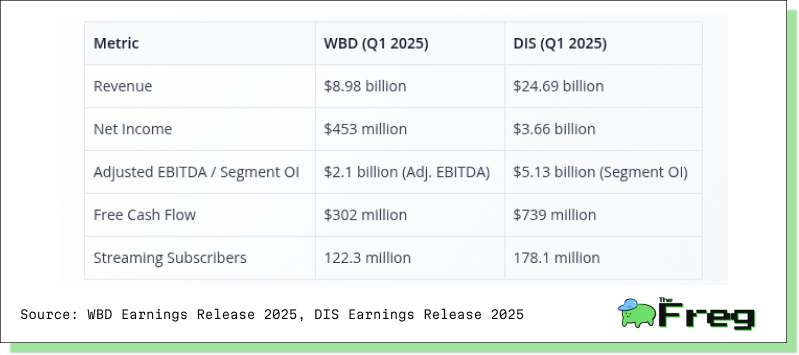 Disney’s financial scale is substantially larger, with nearly three times the revenue and net income of WBD in Q1 2025. Disney’s segment operating income and free cash flow also outpace WBD, reflecting stronger profitability and cash generation. Both companies are growing their streaming subscriber bases, but Disney’s lead in both scale and profitability is clear. WBD’s positive net income and EBITDA signal progress in its turnaround, but its free cash flow remains modest relative to its size, highlighting ongoing investment and debt service needs.