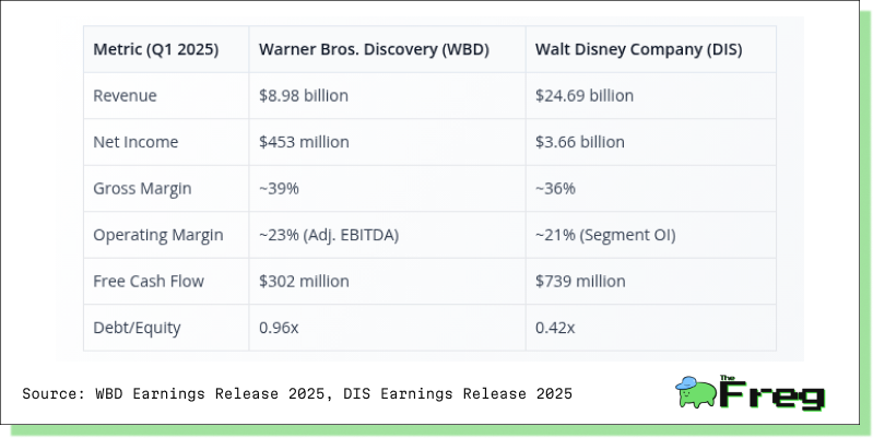 - Scale & Profitability: Disney’s revenue and net income are nearly three times higher than WBD’s, underscoring its superior scale and earnings power. This gap reflects Disney’s diversified business model, global brand strength, and robust performance across content, streaming, and experiences.