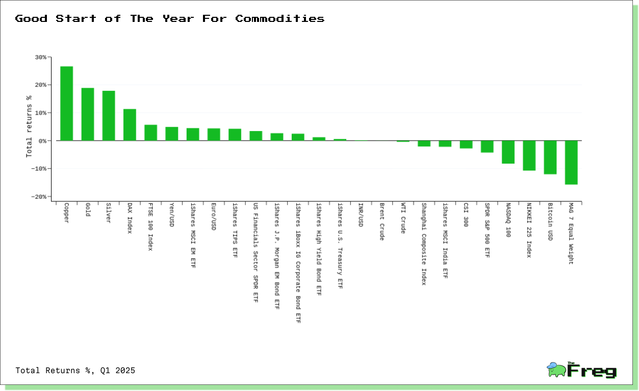 Gold and copper emerged as standout performers in the commodities market during Q1 2025, collectively contributing to nearly 75% of the total return in a major commodity indices despite representing only 27.5% of the index weight. Gold prices have since surged to $3,162.79 per ounce, this rally was fueled by central bank purchases, geopolitical uncertainties, and investor demand for safe-haven assets. Copper also showed strength, with prices reaching